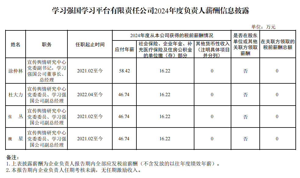 学习强国学习平台有限责任公司2024年度负责人薪酬信息披露-中国文明网