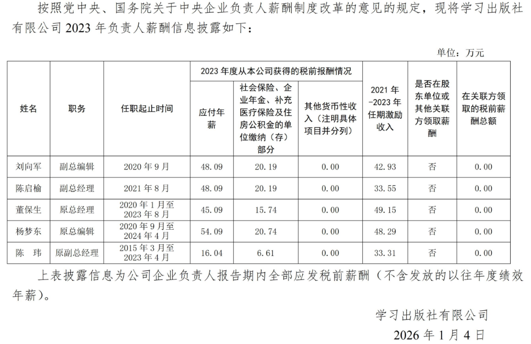 学习出版社有限公司企业负责人2023年度薪酬情况