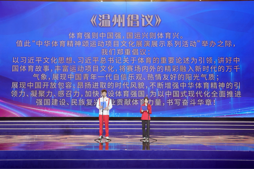 启动仪式上,巴黎奥运会冠军黄雨婷、潘展乐共同宣读运动项目文化建设“温州倡议”。倡议提出,讲好中国体育故事,丰富运动项目文化,将赛场内外的精彩融入新时代的万千气象,不断增强中华体育精神的引领力、凝聚力、感召力。