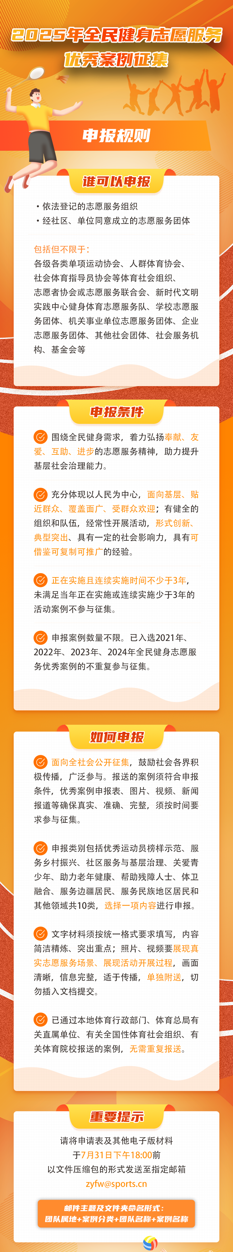 2025年的案例征集活动将继续面向全国体育系统及全社会广泛征集,申报类型仍为十大类别:优秀运动员榜样示范、服务乡村振兴、社区服务与基层治理、关爱青少年、助力老年健康、帮助残障人士、体卫融合、服务边疆居民、服务民族地区居民及其他特色领域,全方位覆盖全民健身志愿服务的多元场景与方向,须选择一类进行申报。