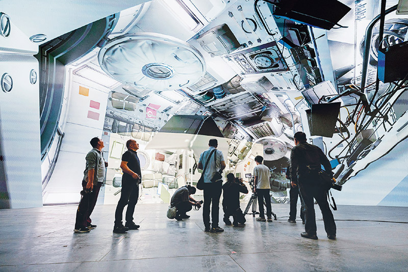 电影科技的发展、技术美学的进步、叙事方式的创新、视觉图谱的转换,为讲好中国故事、实现中华优秀传统文化创造性转化和创新性发展提供了坚实支撑。图为2025年4月10日,参观者在浙江省湖州市德清县莫干山AI影视城体验AI虚拟制片技术。人民图片