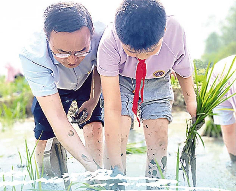 合肥市少儿艺术学校学生在校外劳动教育实践基地学习插秧。(资料图片)