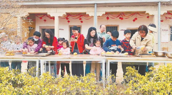 亲子家庭在苇渡农耕文化基地体验手作乐趣。