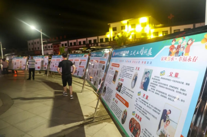 活动现场设置的全国文明村镇风采展、三代人婚照展等展区。