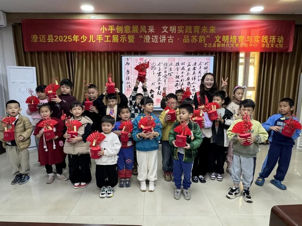 海南省澄迈县新时代文明实践中心开展“我在新时代文明实践中心过大年”少儿手工展示活动。在志愿者的示范与指导下,家长们协助孩子们把树枝插入放有红色彩泥的福桶中,孩子们充分发挥创意,将红色彩泥捏成各种形状花朵,装饰在树枝上。制作过程中,孩子们不仅锻炼了动手能力,还了解了抱福桶所蕴含的祈福纳祥文化寓意。