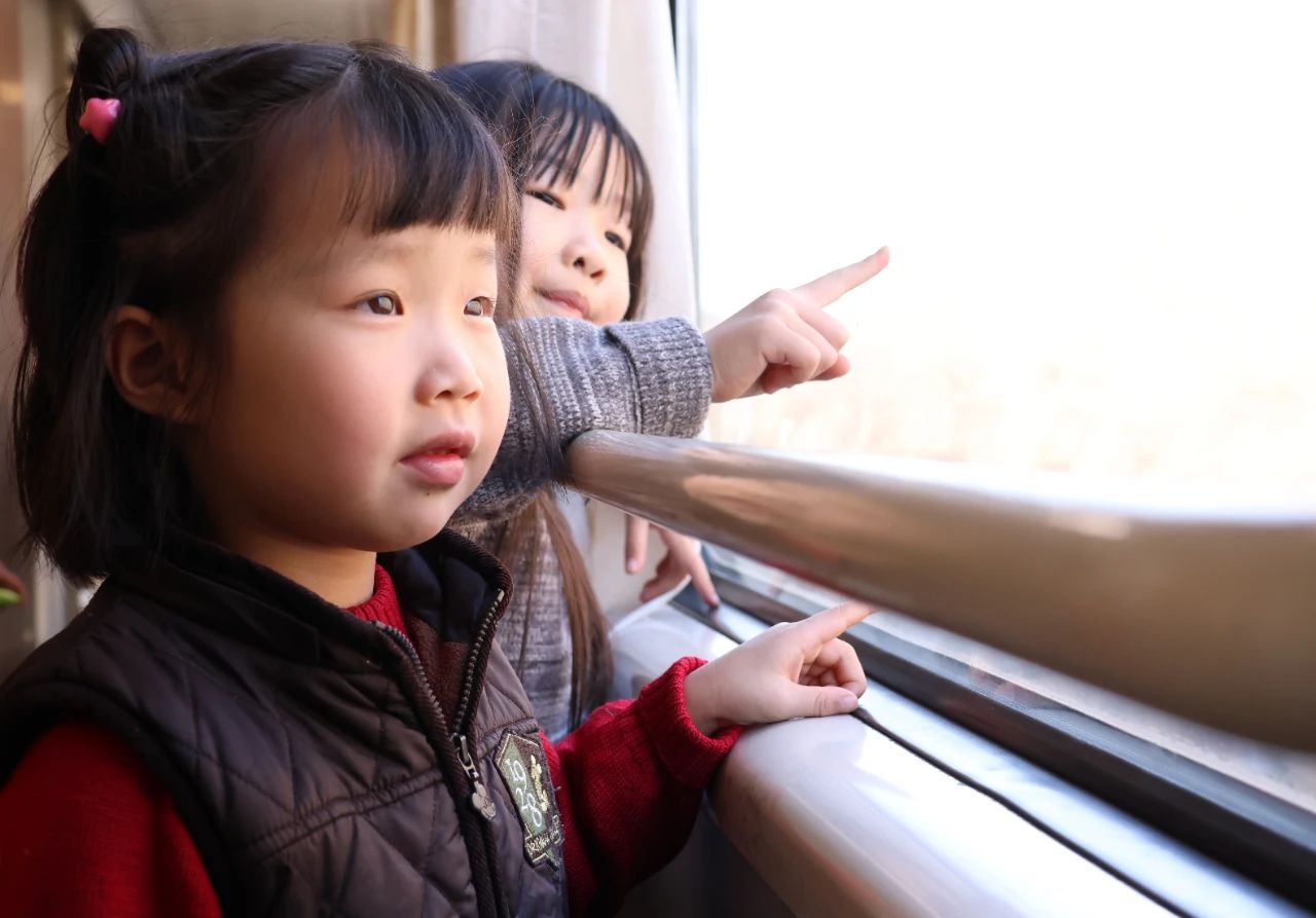 小朋友们欣赏着窗外掠过的风景,眼里都是满满的幸福快乐感。
