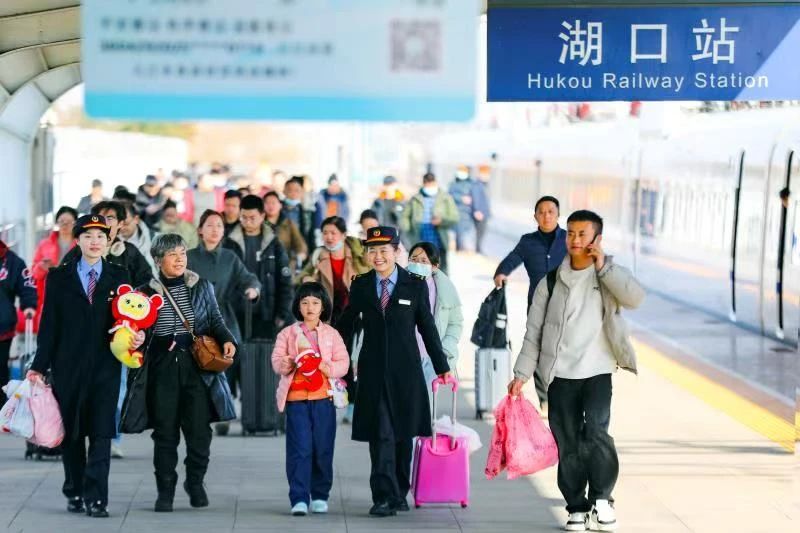 江西省九江市湖口县火车站工作人员为旅客提供温馨服务。