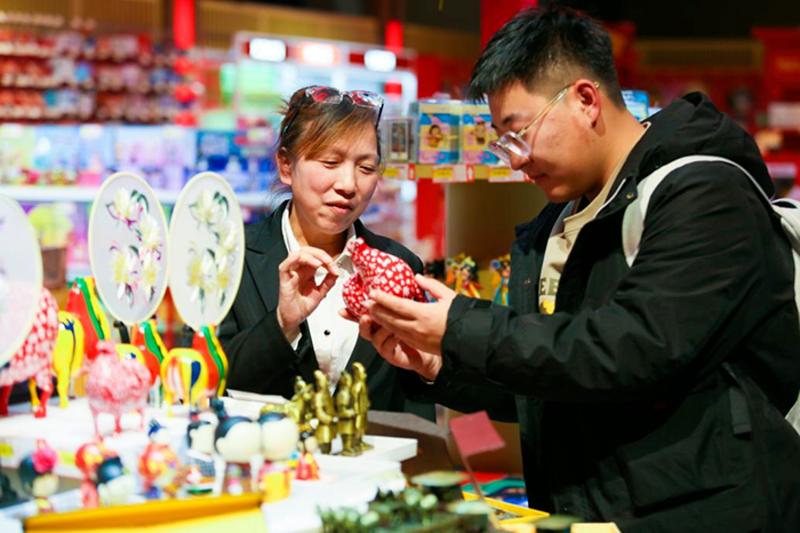 西安站文创店工作人员向旅客介绍文创产品。