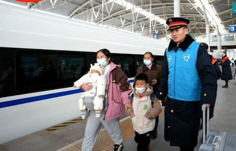 车站工作人员为旅客提供咨询引导和帮扶服务。