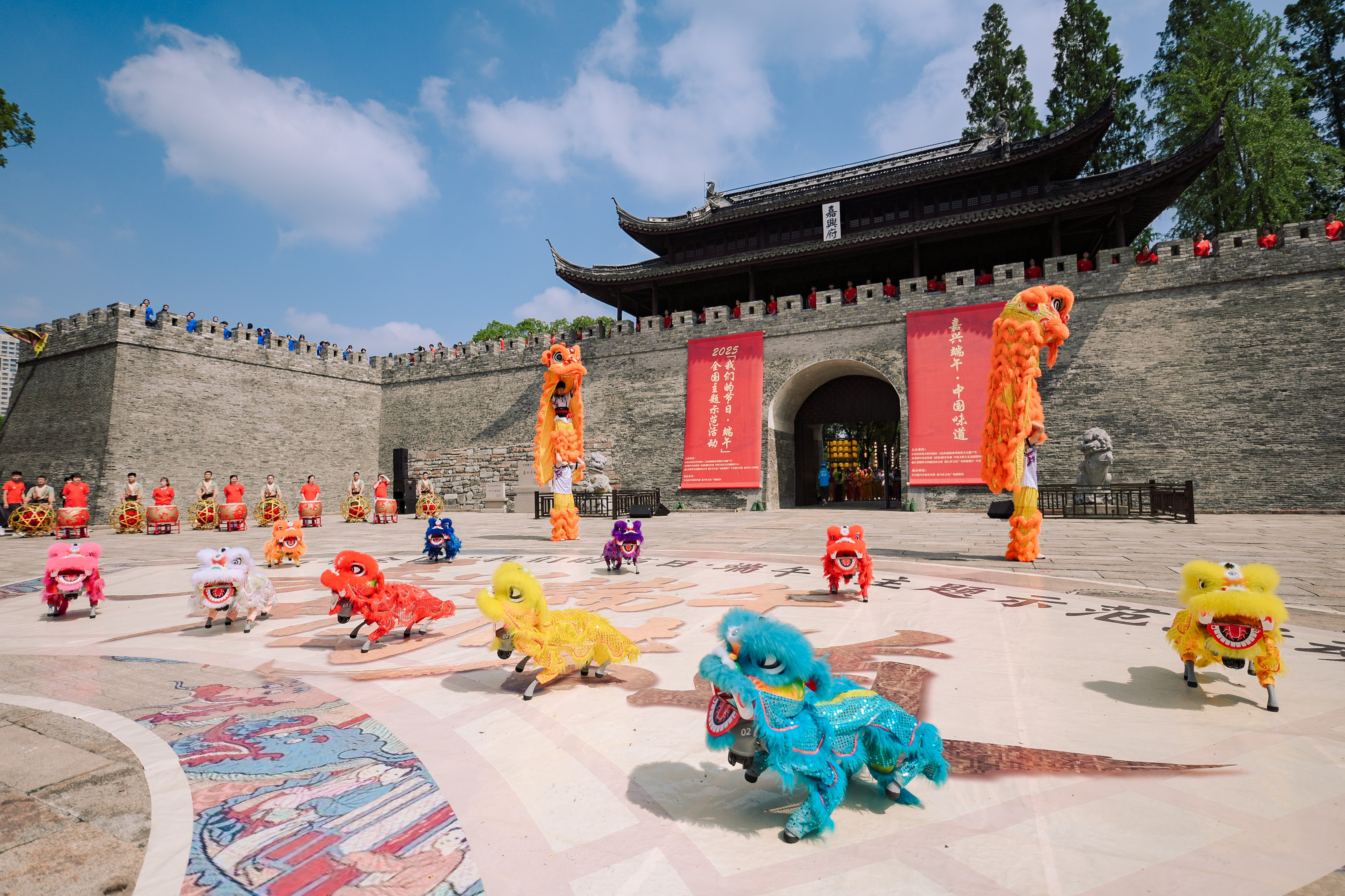 子城门前广场热闹非凡。到场嘉宾鸣锣开幕、为祥龙点睛,启动2025年全国“我们的节日·端午”主题示范活动暨嘉兴端午民俗文化节,并共同参观子城端阳大集,观看非遗表演、香囊互动展示等项目。活动现场,机器狗与真人舞狮表演精彩亮相,让传统非遗与现代科技紧密交融、创新传播。百名来自嘉兴南湖学院、嘉兴大学的青年学生代表在子城广场和城楼上吟诵爱国诗词,展现青春风采。“中国好人”、浙江省南湖革命纪念馆讲解员袁晶为大家介绍了嘉兴历史文化、端阳大集特色。