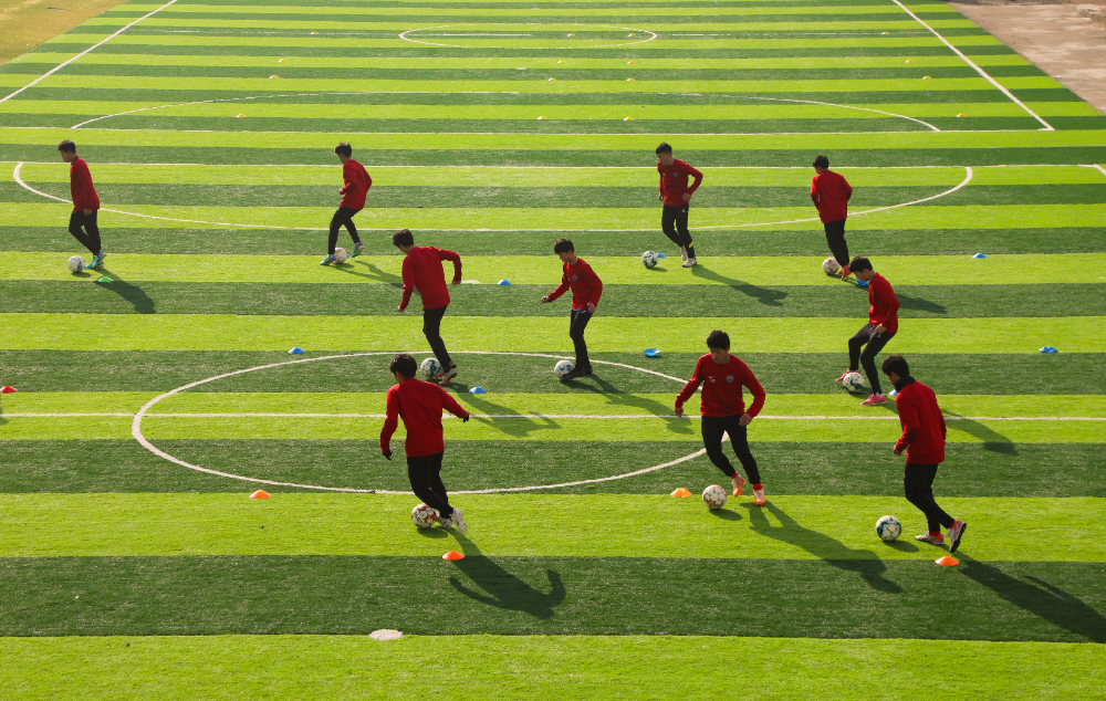 青少年学员在丰乐镇河湾体育综合训练基地进行足球训练。