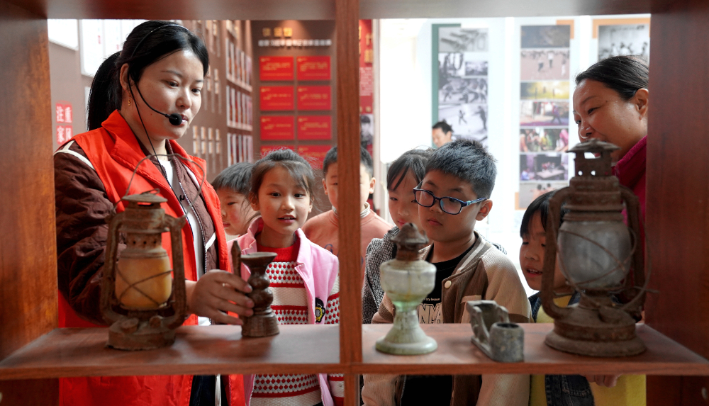 村民在新时代文明实践站参观移风易俗主题宣传墙。
