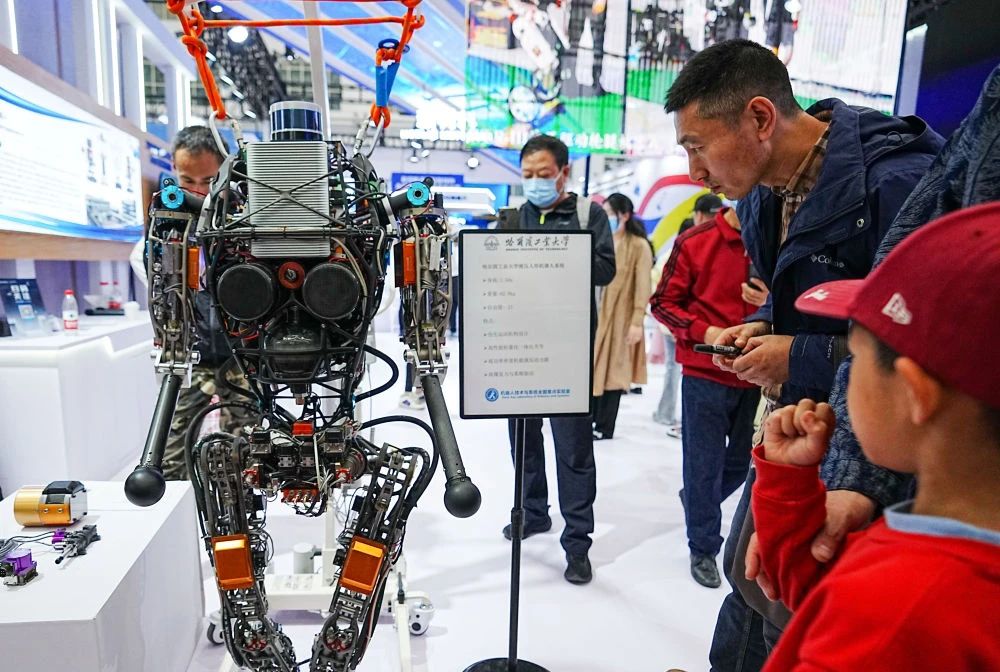 2024年5月19日,在第八届中俄博览会新质生产力科技成果展区,参会者在了解哈工大液压人形机器人系统。新华社记者 王建威 摄