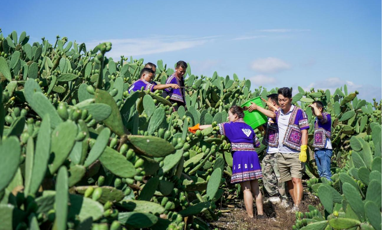 村子美了,致富之路就更通畅了。庄子田村结合喀斯特地貌的实际,大力发展种植仙人掌,采取“党支部+合作社+基地+农户”模式,动员群众以土地流转方式入股合作社,让土地变“股权”、村民变股民。通过合作社抱团发展,庄子田仙人掌种植面积从700亩发展到3000亩,亩产也得到大幅提升。为提升庄子田仙人掌果的知名度,拓宽果子销售渠道,2022年8月,合作社以仙人掌的彝族语言“啊妞”申请成立文山菁啊妞农业有限公司,给仙人掌果打上“菁啊妞”品牌标签,在线下零售、批发的同时开设了线上销售,让“菁啊妞”远销北京、上海、广州等地。2024年,庄子田村还举办了开园采摘活动,吸引了大量游客,让越来越多的人知道了“菁啊妞”,喜欢上了“菁啊妞”。