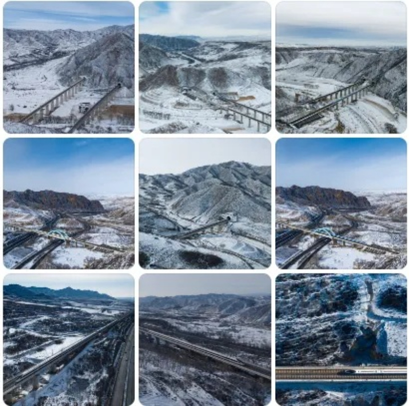 雪后高铁穿越崇山峻岭,与大自然共同描绘出浓墨重彩的磅礴画卷。