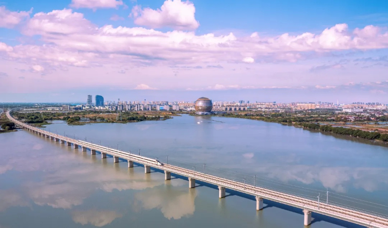 沪苏湖高铁列车从江苏省进入浙江省南浔区沈庄漾。