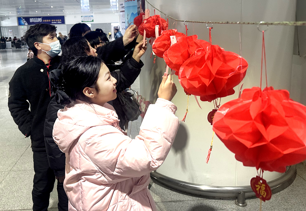南阳火车站候车大厅内张灯结彩,洋溢着节日的喜庆,猜灯谜活动吸引了众多候车旅客参与。