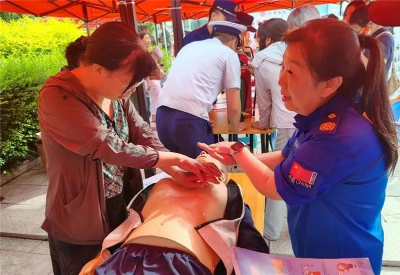 在8月12日举行的阳原县文明市集主题活动中,应急救援人员借助人体模型,向群众演示急救操作,普及应急救援知识,传递实用技能,围观的群众纷纷跟着学习。