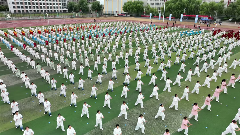 在蔚县第一中学操场,1200余名太极爱好者随着悠扬音乐整齐展演《八段锦》《二十四式太极拳》。8月8日举办的“全民健身 太极同行”千人太极展演活动,成为张家口推动全民健身与文明实践深度融合的生动实践。