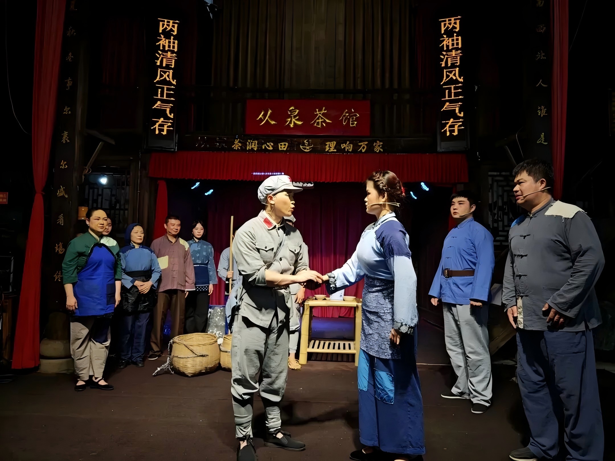 金秋时节,古色古香的江西宜春万载古城从泉茶馆里座无虚席,人声鼎沸。随着一声清脆的开场锣声,一场场“理论+文艺”的创新理论宣讲在茶馆的戏台精彩上演。今年9月底,万载“大碗茶”理论宣讲志愿服务队编排的主题宣讲精品课程《又见映山红·大碗茶里的苏区精神》作为2025年全国“我们的节日·中秋”主题文化活动江西省主场活动的重要内容,也在这座茶馆进行了宣讲。通过“英雄茶、将军茶、愚公茶、冠军茶”四道大碗茶,串联起四个镌刻着苏区精神的万载本地动人故事,让听众从中感受跨越时代的精神共鸣。