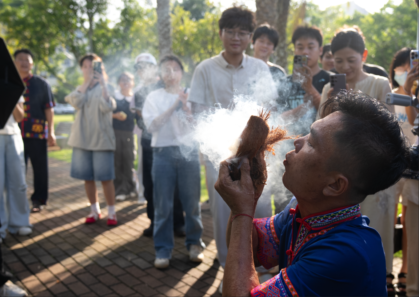 为增强体验感,活动特别邀请了海南省级非遗“黎族钻木取火技艺”代表性传承人王照方及多位县级传承人现场教学。当传承人身着原始质朴的树皮服饰登场时,仿佛从历史中走来,瞬间成为全场焦点。