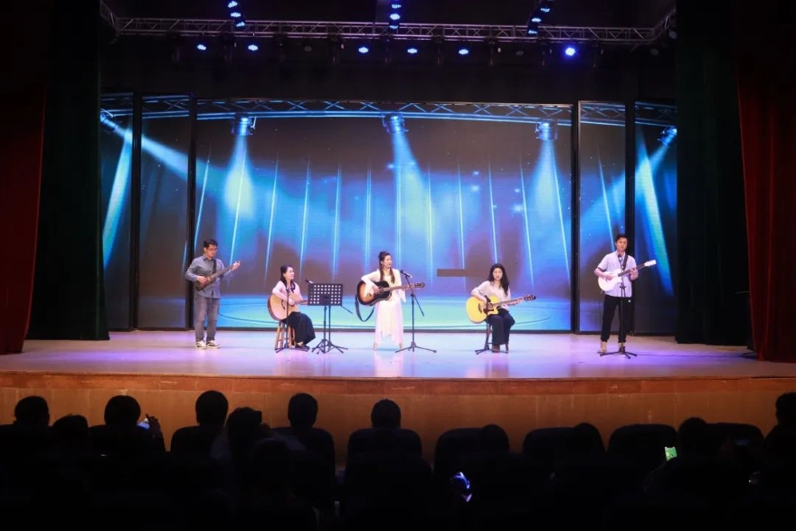 2025年4月15日晚,2024年度佛冈县“青年夜校”系列活动培训班结课仪式上,吉他班成员弹唱表演。通讯员供图