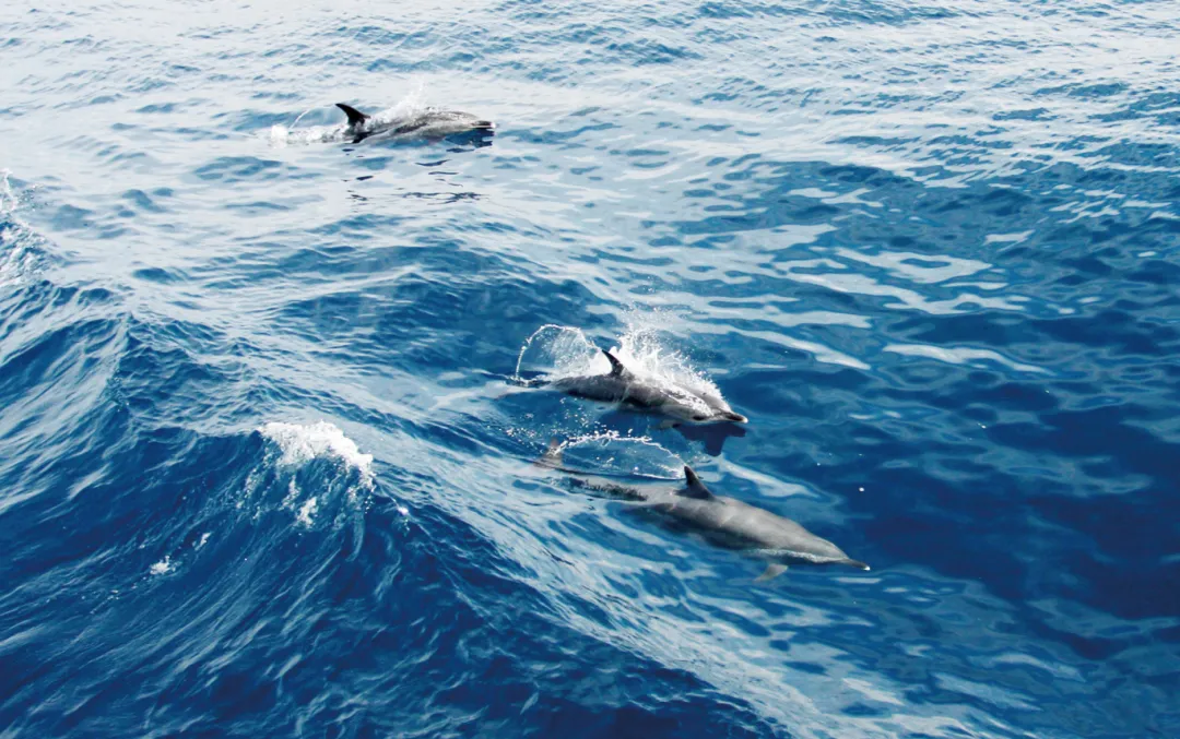 在三亚近海,海豚正在水面欢快跳跃