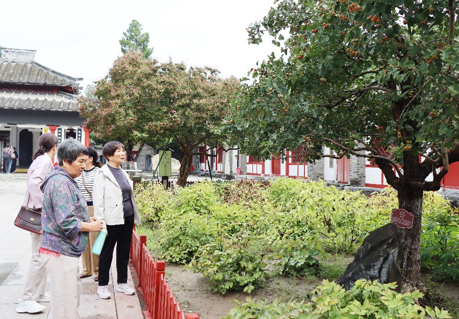 9月24日,游客在南阳市医圣祠辨识山楂等中药材。