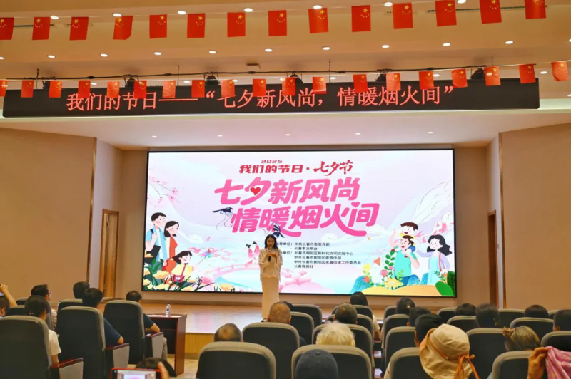 七夕节前夕,长春市朝阳区永昌街道办事处内座无虚席,“我们的节日·七夕节”——“七夕新风尚,情暖烟火间”主题文明实践活动正在进行中。近百名居民来到现场,赏歌舞、听弹奏、玩互动游戏、体验非遗,在民俗互动中触摸文化根脉。