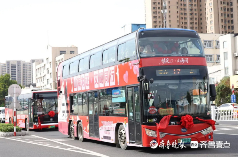 装扮喜庆浪漫的17路和51路公交车,载着新人们向幸福出发。