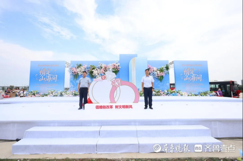 8月28日上午,“情定山海间”烟台市移风易俗主题集体婚礼举行。