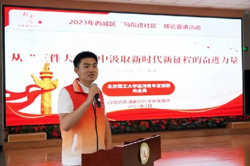 2023年7月,北京理工大学博士研究生、北京理工大学延河青年宣讲团团长冉金昊,在白纸坊街道新时代文明实践所为区域化党建成员单位代表、辖区文明单位、文明家庭代表、社区老党员以《从“三件大事”中汲取新时代新征程的奋进力量》为主题进行理论宣讲。