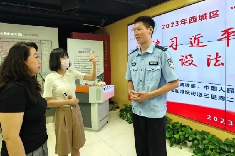 2023年7月,在月坛街道三里河二区社区新时代文明实践站“马院进社区”新时代文明实践理论宣讲活动中,社区居民为中国人民公安大学宣讲团成员刘峻豪的宣讲“点赞”。