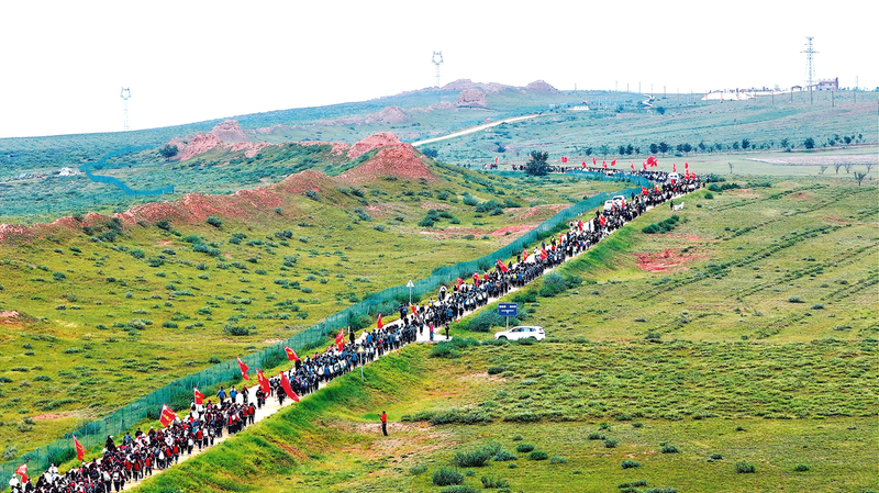8月25日清晨5时,吴忠市同心县2800余名高一师生踏上往返42公里的红色研学征程。从同心县中国工农红军西征纪念园出发,徒步至王团北堡子爱国主义教育基地,沿途聆听革命故事、共唱红色歌曲,在行走中感悟长征精神,在汗水中淬炼青春信念。