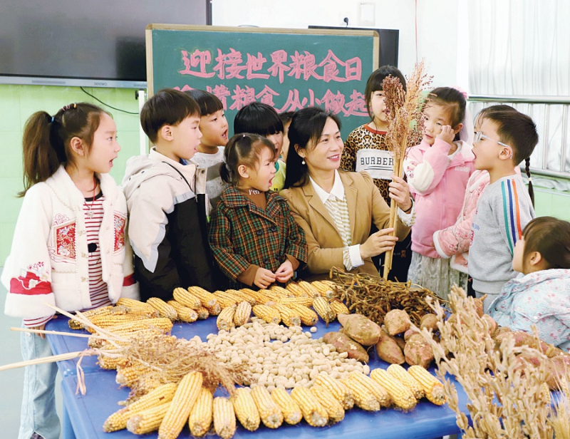 10月15日,在世界粮食日来临之际,南阳市宛城区茶庵街道第一中心幼儿园开展“珍惜粮食 从小做起”主题宣传活动,教孩子们认识各种粮食作物,让孩子们从小树立珍惜粮食、节约粮食的意识,激发幼儿对劳动人民的尊敬之情。图片来源:南都晨报