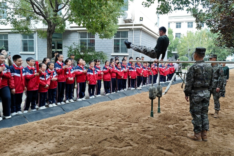 官兵们为同学们展示日常军事训练项目。图片来源:南阳晚报