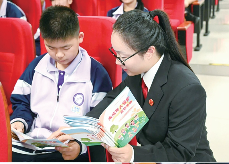 南阳市高新区法院走进南阳市第二十一完全学校,开展以“守护青春 与法同行”主题宣讲活动,通过作报告、发放宣传材料、现场提问检测等形式,对广大学子进行法治安全教育。图片来源:南阳晚报