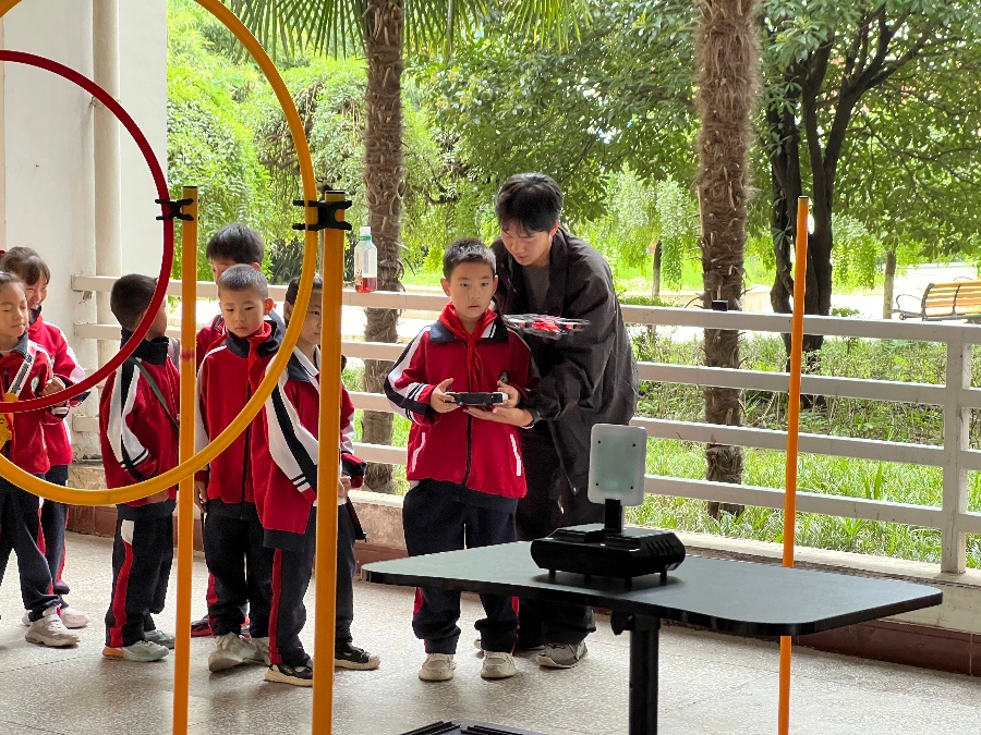 校园里,科技大篷车带来了众多集科学性、参与性、趣味性为一体的声光电展品,让学生耳目一新。在老师的讲解指导下,学生或观察或思考,或操作或交流,认真体验,在与产品的亲密互动中感受科学实践带来的快乐。与此同时,校园另一边多架无人机在精准的控制下腾空而起,它们穿过圆环,绕过障碍物,精彩的表演将现场氛围推向高潮。操场附近,“小球爬楼梯”“神奇倍力桥”“投石机比拼”等一系列融合科学原理与趣味挑战的活动区域吸引学生积极参与,极大地激发了同学们的团队协作意识,提高了他们的动手能力,在玩乐中领悟了科学的奥秘。