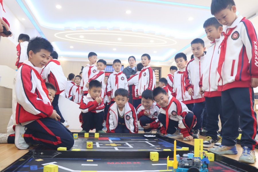 日前,南阳市第二十三小学校学生代表走进河南工业职业技术学院“科技研学营”,通过近距离观察和动手操作工业机器人项目、无人机技术等,感受智能制造和航空科技的魅力。图片来源:南阳市第二十三小学校