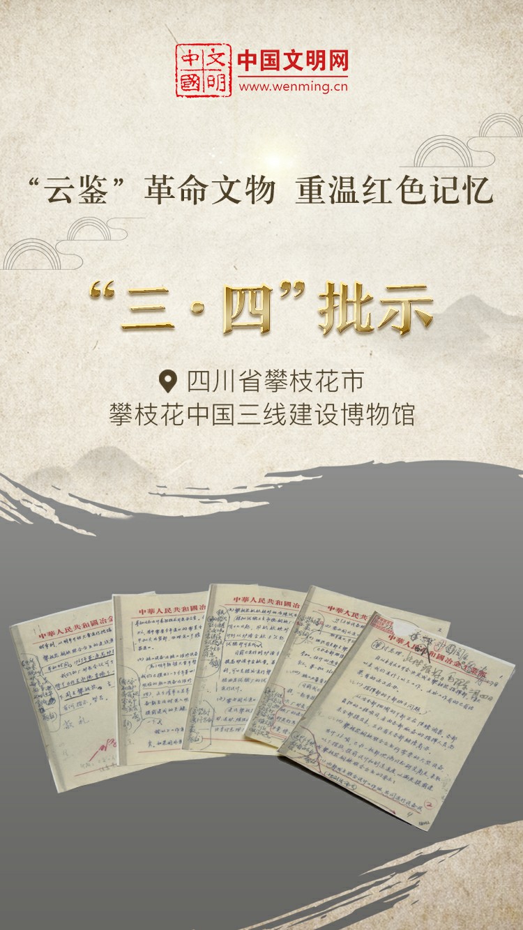 革命文物,承载党和人民英勇奋斗的光荣历史,是弘扬革命传统和革命文化、加强社会主义精神文明建设、激发爱国热情、振奋民族精神的生动教材。中国文明网“文明之声·云鉴馆藏”专栏邀您走进各地革命博物馆、纪念馆、党史馆等红色主题场馆,一起“打卡”红色地标,“云鉴”红色馆藏,汲取奋进力量。今天为您介绍攀枝花中国三线建设博物馆的馆藏文物——“三·四”批示。