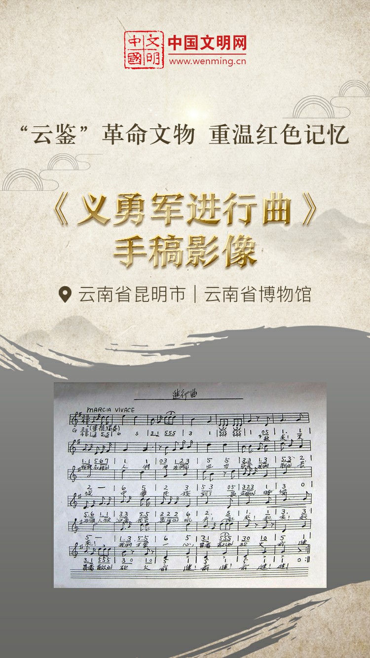 革命文物,承载党和人民英勇奋斗的光荣历史,是弘扬革命传统和革命文化、加强社会主义精神文明建设、激发爱国热情、振奋民族精神的生动教材。中国文明网“文明之声·云鉴馆藏”专栏邀您走进各地革命博物馆、纪念馆、党史馆等红色主题场馆,一起“打卡”红色地标,“云鉴”红色馆藏,汲取奋进力量。今天为您介绍云南省博物馆的馆藏文物——《义勇军进行曲》手稿影像。