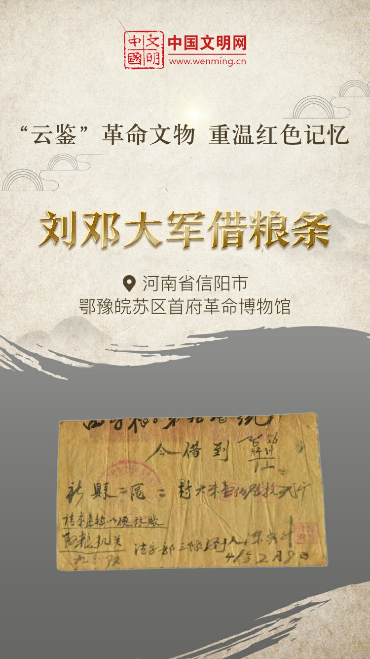 革命文物,承载党和人民英勇奋斗的光荣历史,是弘扬革命传统和革命文化、加强社会主义精神文明建设、激发爱国热情、振奋民族精神的生动教材。中国文明网“文明之声·云鉴馆藏”专栏邀您走进各地革命博物馆、纪念馆、党史馆等红色主题场馆,一起“打卡”红色地标,“云鉴”红色馆藏,汲取奋进力量。今天为您介绍鄂豫皖苏区首府革命博物馆的馆藏文物——刘邓大军借粮条。