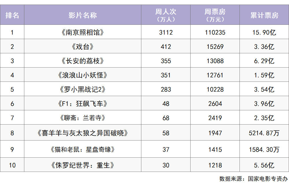 由申奥执导的抗战题材影片《南京照相馆》以单周11亿元票房产出遥遥领先,稳居票房榜首。陈佩斯主演的《戏台》和大鹏执导的《长安的荔枝》分列周榜第二、第三位,周票房分别为1.52亿元和1.30亿元。