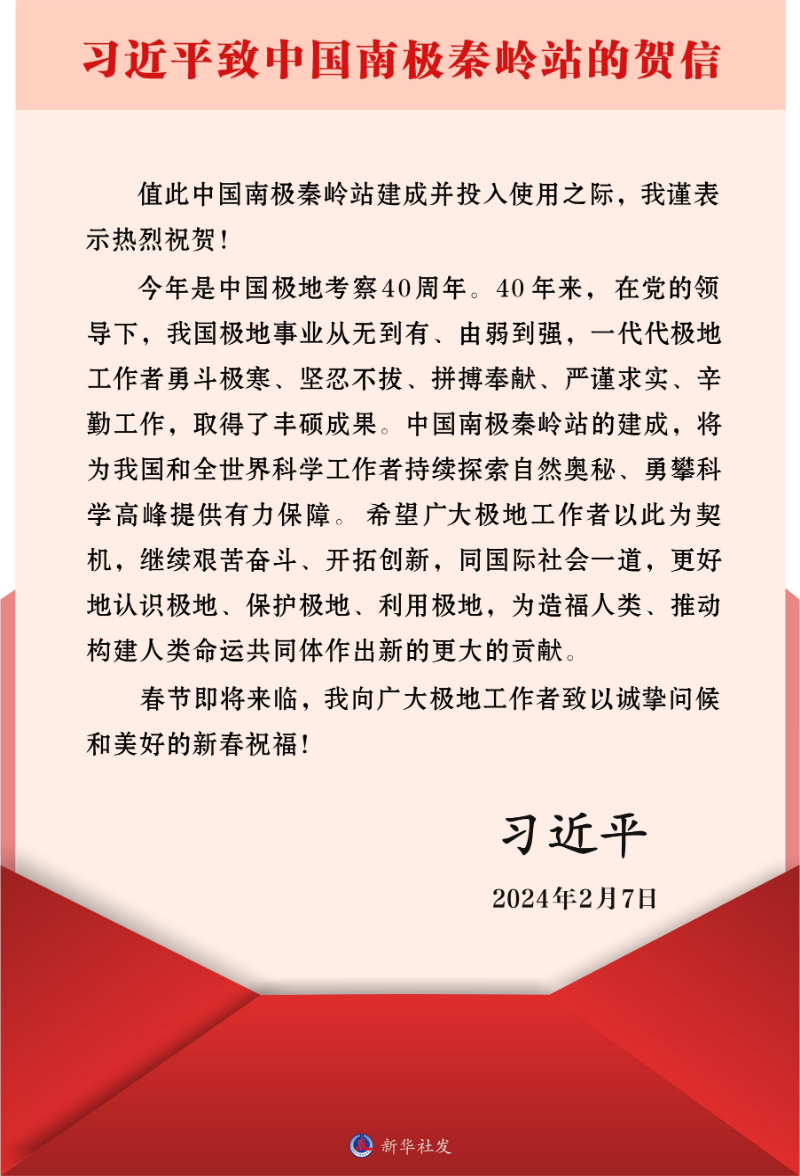 新华社北京2月7日电 龙年春节前夕,中国南极秦岭站7日建成并投入使用。中共中央总书记、国家主席、中央军委主席习近平致信表示热烈祝贺,向广大极地工作者致以诚挚问候和美好的新春祝福。