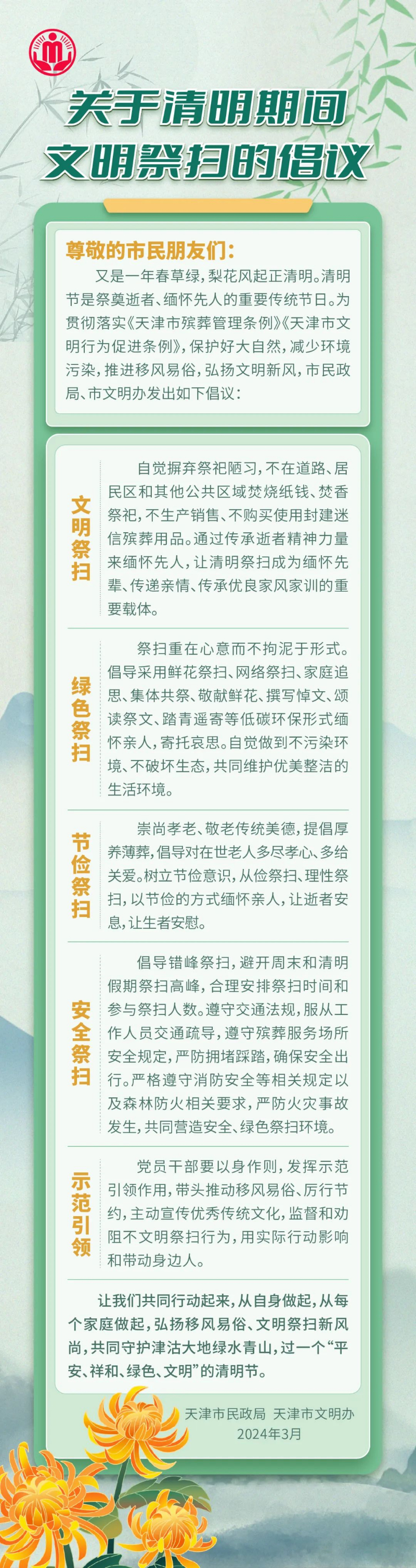 在2024年清明节来临之际,为实现文明祭扫、平安清明的目标,天津市民政局、天津市文明办联合向广大市民发出如下文明祭扫平安清明倡议书: