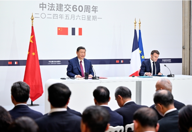 习近平指出,很高兴应马克龙总统邀请,在中法建交60周年之际,再次对法国进行国事访问。我同马克龙总统举行了富有成果的会谈。我们一致认为,中法关系具有珍贵历史、独特价值和重要使命,双方要传好历史的接力棒,弘扬中法建交精神并为其赋予新的时代内涵,开启中法关系下一个60年的新征程。
