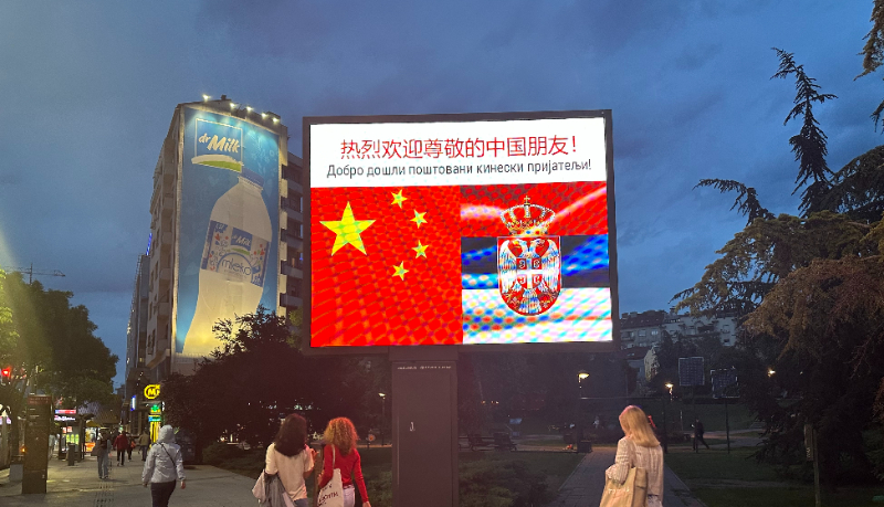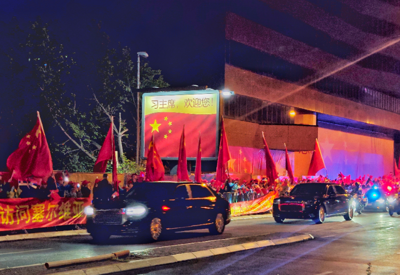 习近平乘车从机场赴下榻饭店途中,贝尔格莱德洋溢着欢乐喜庆的氛围。中塞两国国旗到处迎风飘扬,多处点亮“中国红”,巨幅电子屏滚动播放着“热烈欢迎亲爱的中国朋友”。旅塞华人华侨和留学生以及塞尔维亚民众自发等候在道路两旁,挥舞中塞两国国旗,热烈欢迎习近平到访。