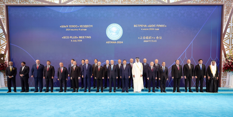 当地时间7月4日下午,国家主席习近平在阿斯塔纳出席“上海合作组织+”阿斯塔纳峰会并发表题为《携手构建更加美好的上海合作组织家园》的重要讲话。峰会开始前,习近平出席托卡耶夫为与会代表团团长举行的欢迎宴会并集体合影。新华社记者 鞠鹏 摄