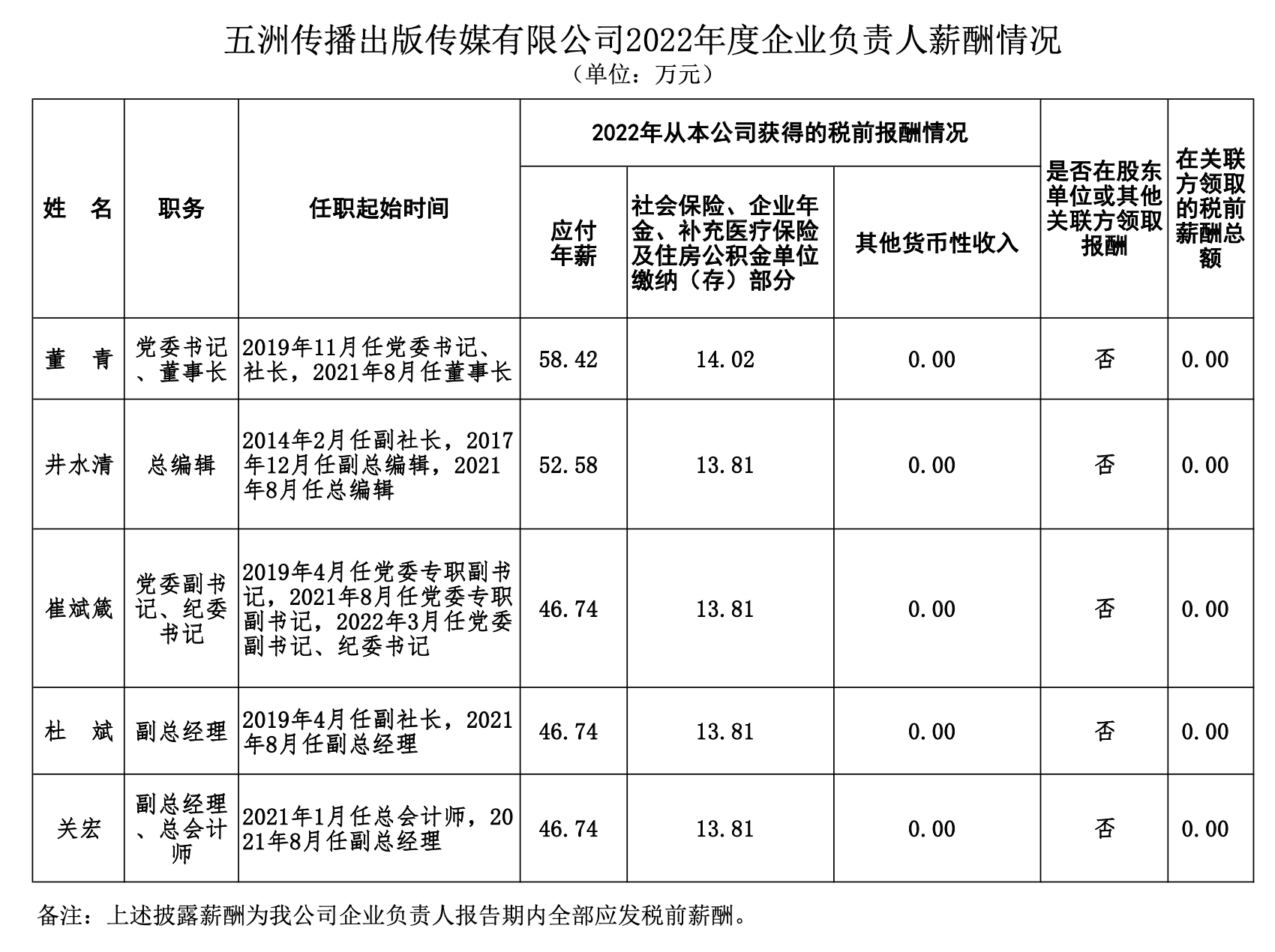 五洲传播出版传媒有限公司2022年度企业负责人薪酬情况-中国文明网