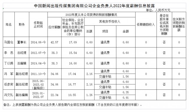 中国新闻出版传媒集团有限公司企业负责人2022年度薪酬信息披露-中国文明网